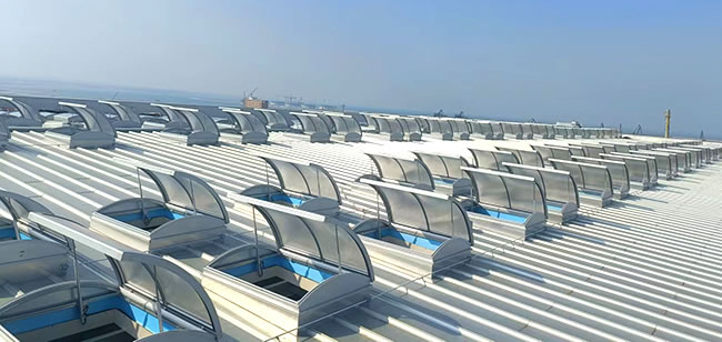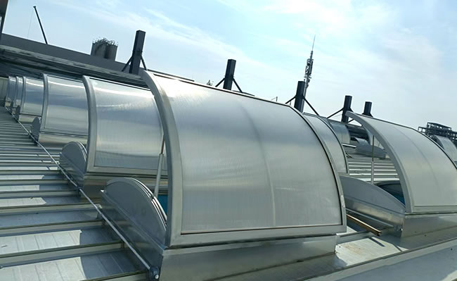 圓拱形的設(shè)計(jì),外觀優(yōu)美、通風(fēng)排煙兼顧自然采光,開啟角度一般為30度到45度***開啟角度為90°。