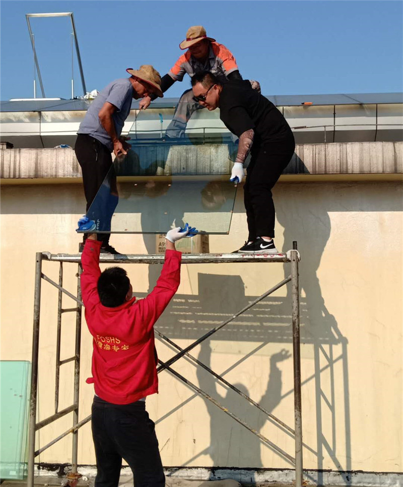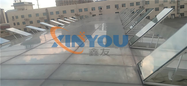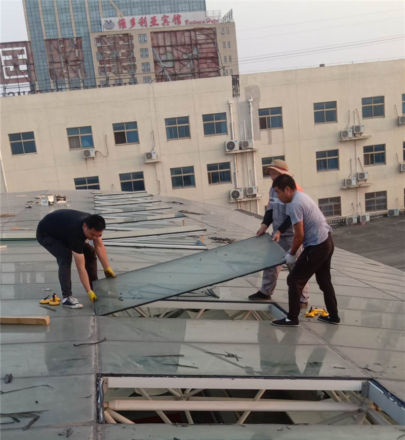 根據(jù)施工圖紙,需先將部分采光玻璃拆除,光滑的玻璃屋面給現(xiàn)場施工增加了難度。現(xiàn)場環(huán)境不允許大型作業(yè)車入場作業(yè),鑫友售后安裝部員工硬是憑自身力氣將一塊塊玻璃拆除,更換上鑫友電動(dòng)排煙窗。