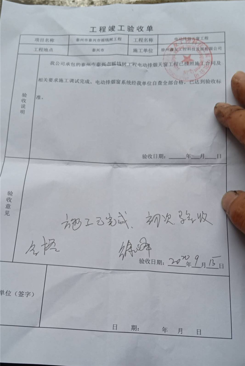 9月15日,現(xiàn)場進(jìn)行了初步驗(yàn)收,所有電動(dòng)排煙天窗及配套設(shè)備運(yùn)行正常,達(dá)到驗(yàn)收標(biāo)準(zhǔn)!項(xiàng)目負(fù)責(zé)人簽寫工程驗(yàn)收單。