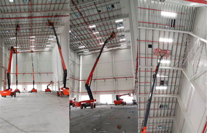 徐州鑫友排煙天窗安裝團隊入駐浙江5210物資公司寧波工廠,正式進入PM包裝廠房,備品備件立體庫的圓拱形天窗施工安裝中。上圖為安裝人員利用升降車作業(yè)中。