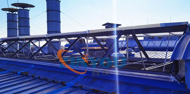 鑫友承接中車唐山8列動(dòng)車組涂裝廠房電動(dòng)采光排煙天窗的設(shè)備供應(yīng)及安裝工程,天窗選擇鋁合金電動(dòng)三角形采光排煙天窗,配置螺桿式開窗機(jī),消防聯(lián)動(dòng)控制箱。