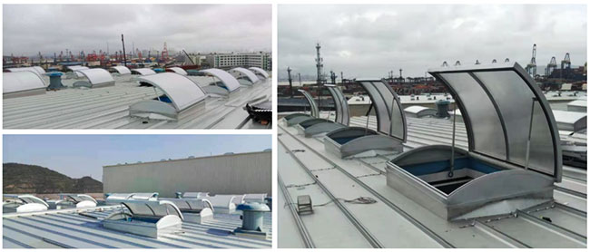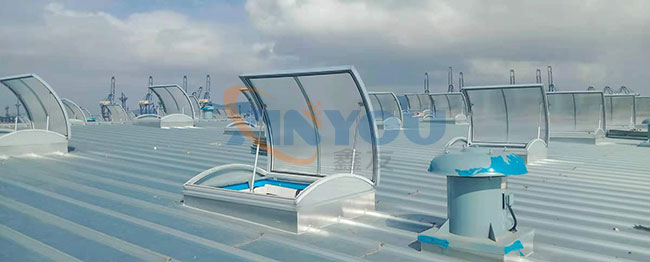 圓拱形的設(shè)計(jì),外觀美觀大氣,能更好的防水,同時有效減少風(fēng)壓阻力,天窗頂部為采光板,有效增加室內(nèi)亮度,開啟電機(jī)設(shè)計(jì)成24V電壓,可連接消防聯(lián)動控制系統(tǒng)及風(fēng)、雨、煙感應(yīng)器。***開啟角度為45°。