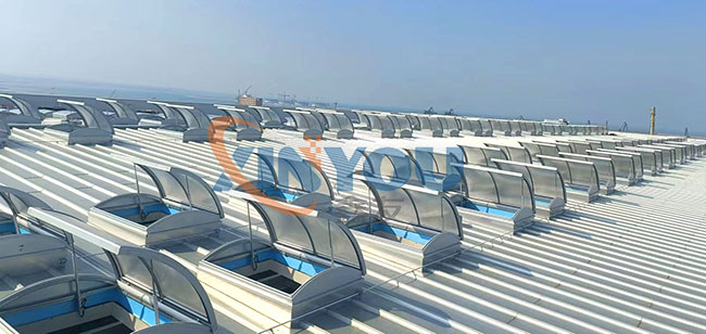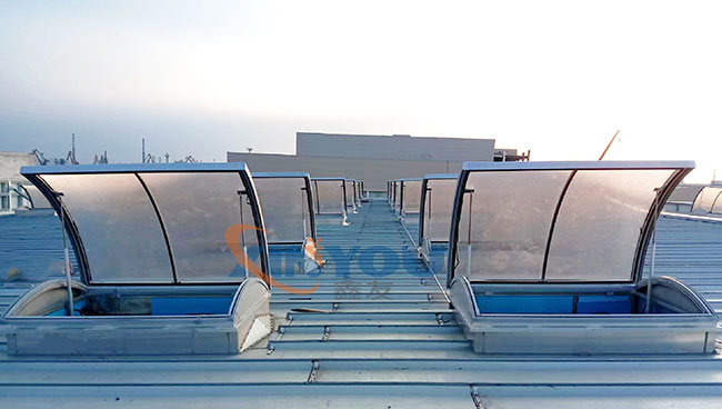 圓拱形的設(shè)計,外觀優(yōu)美、通風(fēng)排煙兼顧自然采光,可實現(xiàn)消防聯(lián)動控制,開啟角度一般為30度到45度***開啟角度為90°。 夏季有利于排水,冬季不積雪。采用單開或?qū)﹂_形式。天窗啟閉按群組控制,每組天窗數(shù)根據(jù)天窗數(shù)量及控制距離決定。